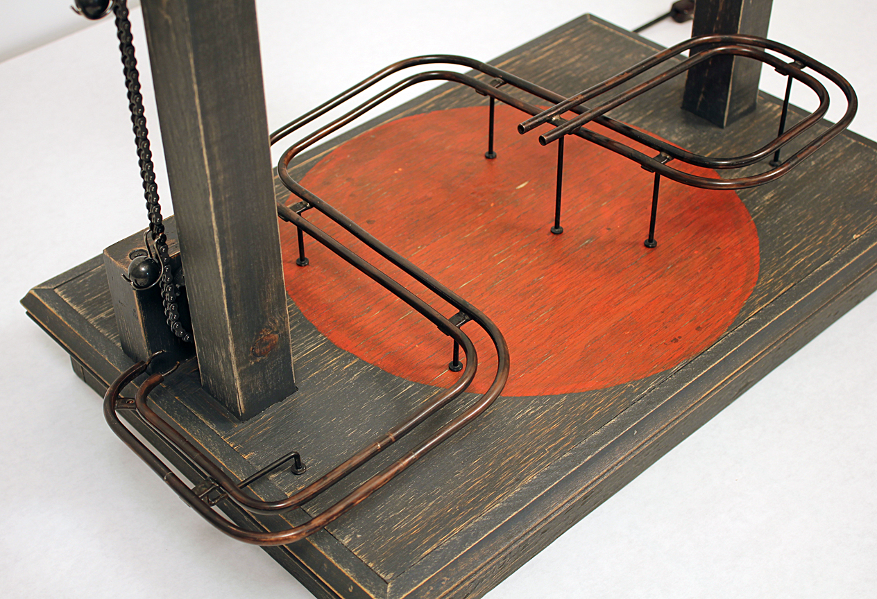 Here I'm figuring out the height of the ramp - where it has to start, how it has to drop, and where it ends. I drilled holes in the cross pieces to accept the 1/8" support rods. Once I had the final height, and soldered the support rods in, I cut off the length with a rotary grinder.